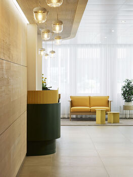 Ein neuer Empfangsbereich für die fenaco, eine schweizerische Agrargenossenschaft mit Weltformat — umgesetzt mit qualitativ hochwertiger Materialisierung und einer Gestaltungs- und Farbenwelt, die sich an der Natur orientiert. Architekturfotografie Bern.